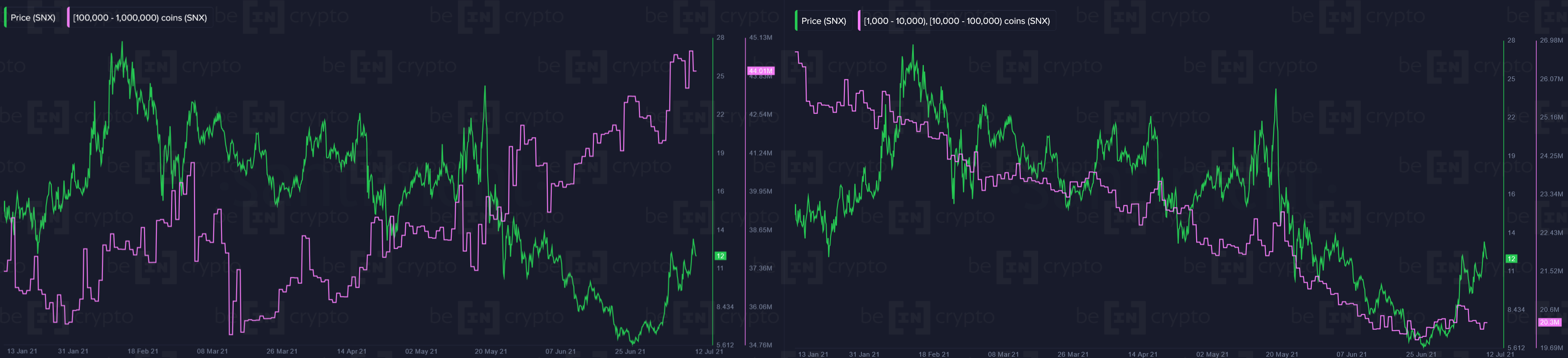 С другой стороны, растет число крупных кошельков с SNX. Совокупные объемы кошельков с балансом от 100 тыс. до 1 млн SNX вырос на 2,45 млн SNX за последние 10 дней. Примечательно, что вопреки уверенности китов, розничные инвесторы, похоже, избавляются от SNX. Например, объемы кошельков с балансом от 1000 до 100 тыс. SNX сократились на 2,6 млн SNX со времен майского ралли.