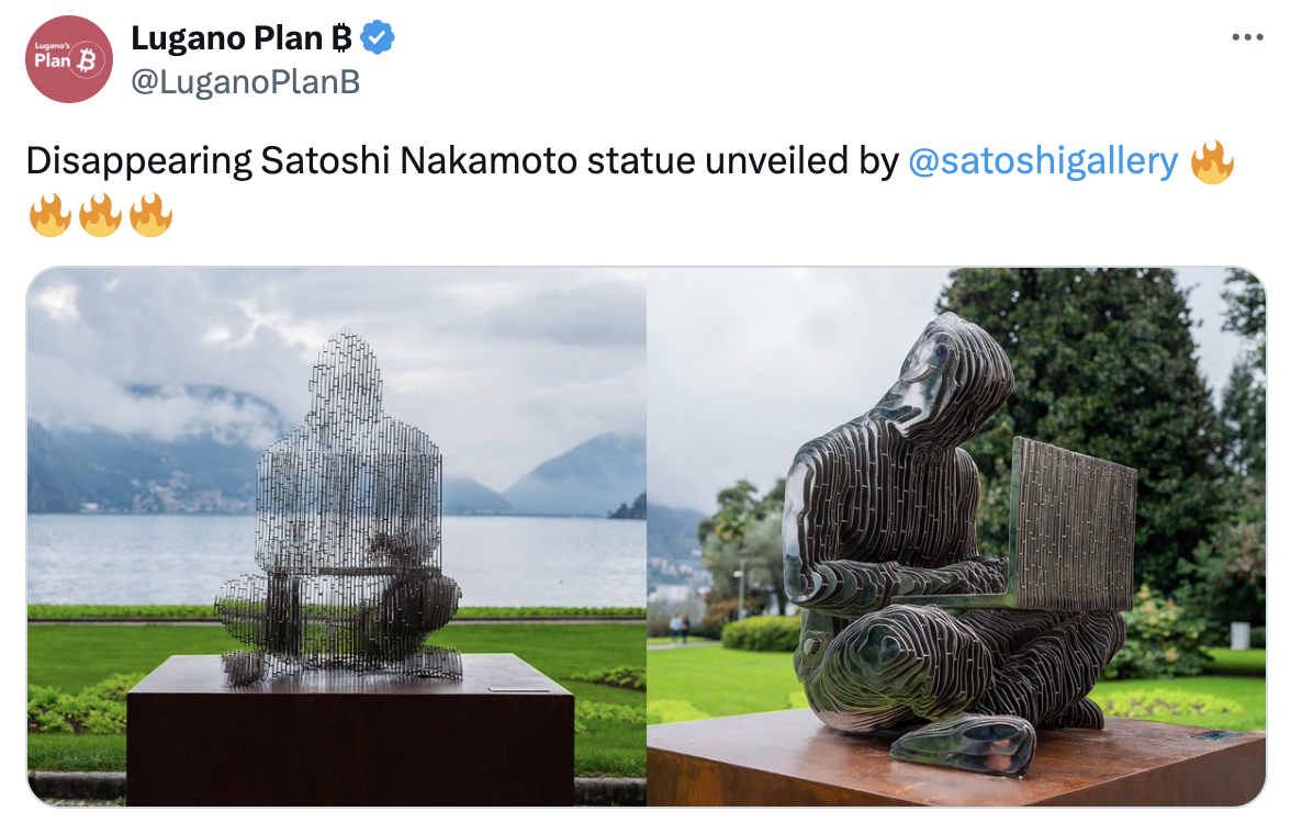 Новый памятник в Лугано изображает безликую фигуру, склонившуюся над ноутбуком. Пикоцци выполнила его из нержавеющей стали. Рассмотреть в полной мере Сатоши можно лишь сбоку.