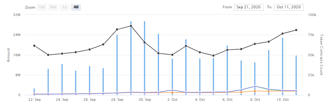 С начала октября площадка показывает уверенный рост транзакций токена CAKE. За этот период Оъем торгов токена вырос до 15 млн., а в воскресенье, 11 октября, было совершено рекордное количество транзакций – 80 921.