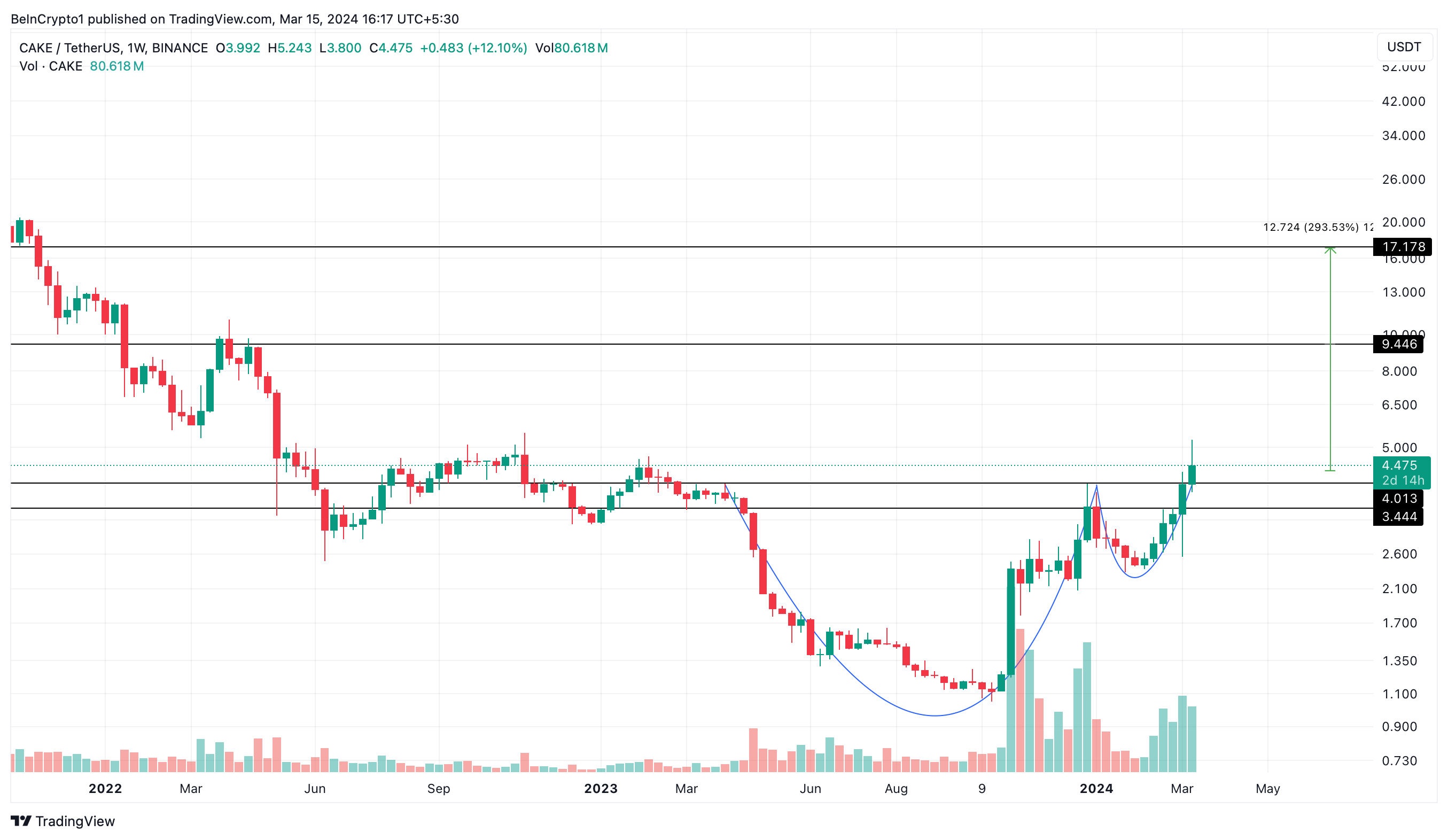 На новостях нативный токен PancakeSwap, CAKE, демонстрирует признаки грядущего взлета. Технический анализ указывает на бычий паттерн «чашка и ручка» на недельных графиках, что говорит о потенциальном росте на 300% примерно до $17.