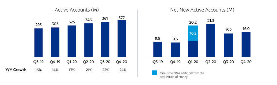 В компании заявляют о росте новых счетов и кошельков, а также об увеличении количества активных кошельков. На конец года количество кошельков, зарегистрированных в системе PayPal составляет порядка 377 млн. Наибольший рост новых регистраций отмечен в четвертом квартале 2020 года. За последние три месяца ушедшего года количество новых регистраций в PayPal увеличилось на 137% в сравнении с показателем 2019 года.