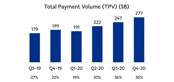 SponsoredВ четвертом квартале 2020 года компания увеличила количество транзакций на 36%, что в долларовом эквиваленте составляет порядка 277 млрд.