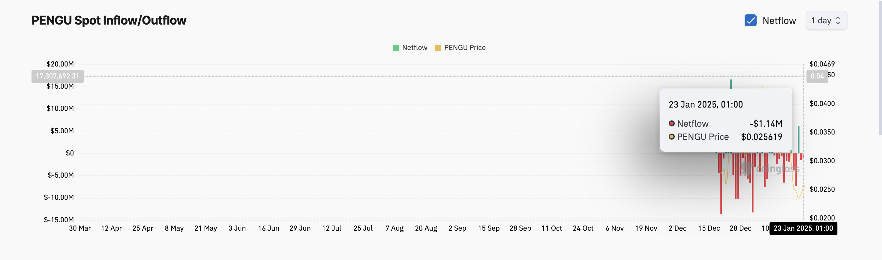 В этот четверг, 23 января, на спотовом рынке PENGU были зафиксированы чистые оттоки в размере $1,14 млн. Это означает, что инвесторы активно фиксируют прибыль на фоне роста цены криптовалюты.
