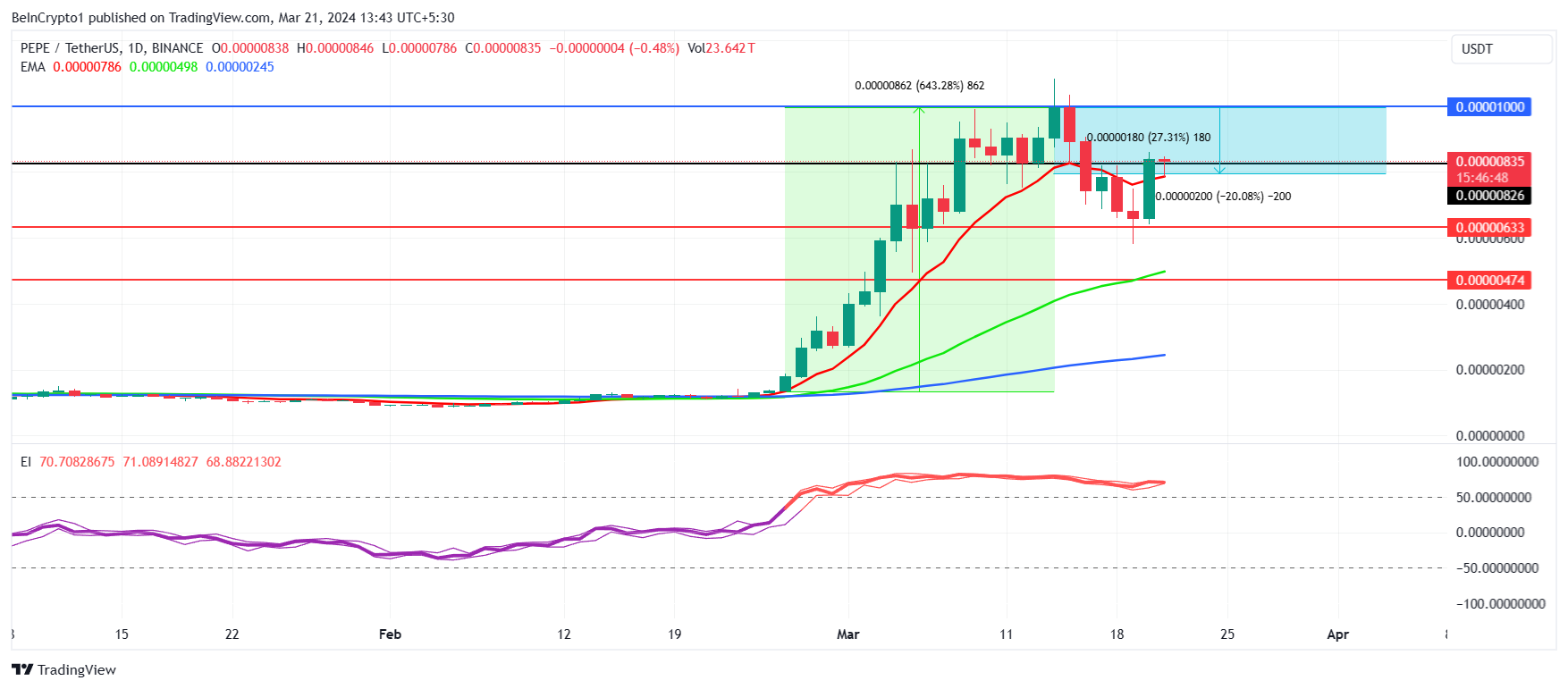 Цена сейчас находится выше важного уровня поддержки, расположенного на отметке $0,00000826, непосредственно над 50-дневной экспоненциальной скользящей средней (EMA). Соответственно, у мемкоина есть шанс установить новый исторический максимум, если он не провалится ниже этой поддержки.