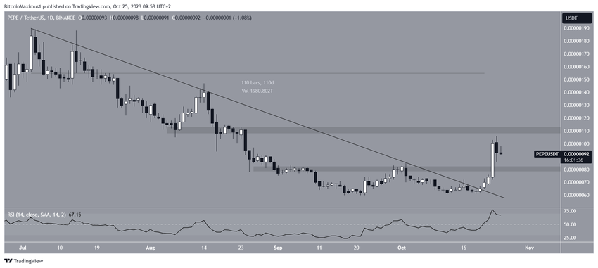 Затем PEPE запустил восходящее движение и 20 октября совершил бычий прорыв линии тренда. Ее возраст к моменту прорыва составлял 110 дней.