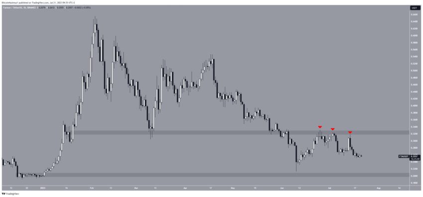Цена FTM упала после того, как 25 июня не смогла прорваться выше области сопротивления $0,32. На данный момент она сформировала три нижних максимума — это свидетельствует о том, что восходящее движение утратило силу.