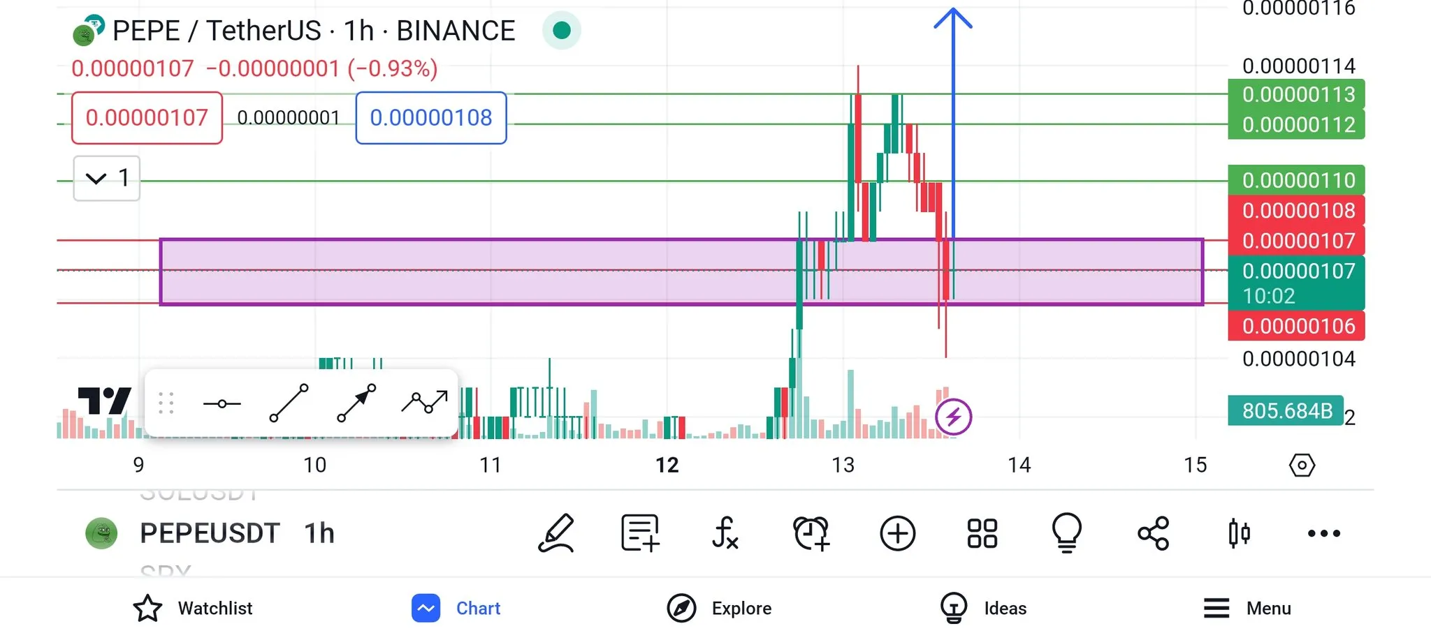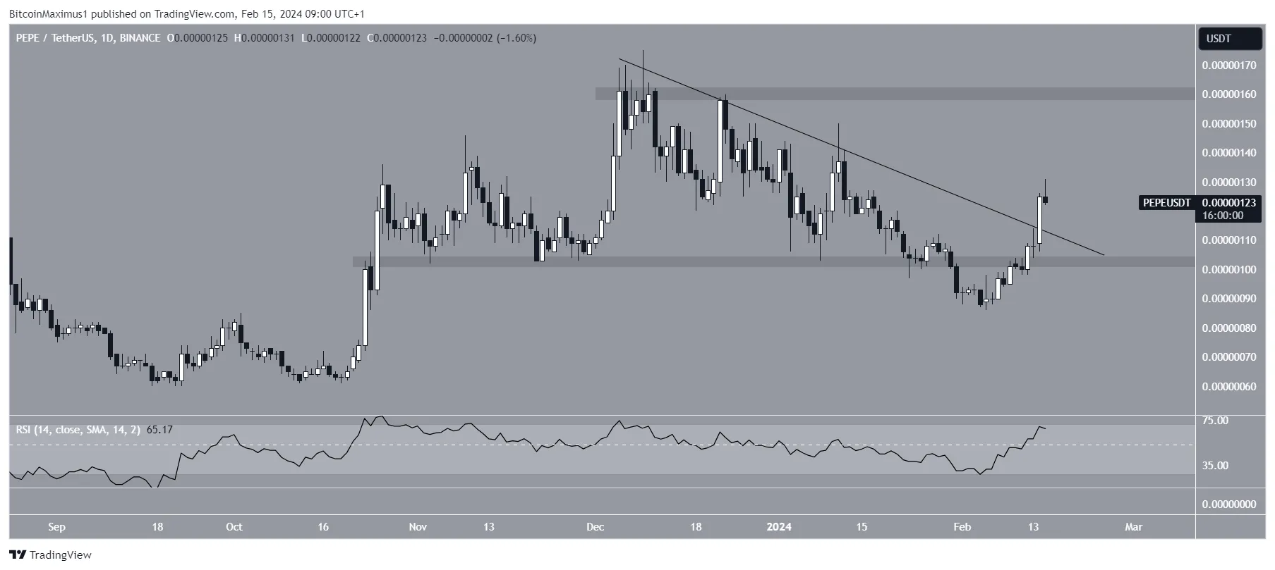 PEPE прорвался выше горизонтального и диагонального уровней сопротивления и готовится к новому скачку.