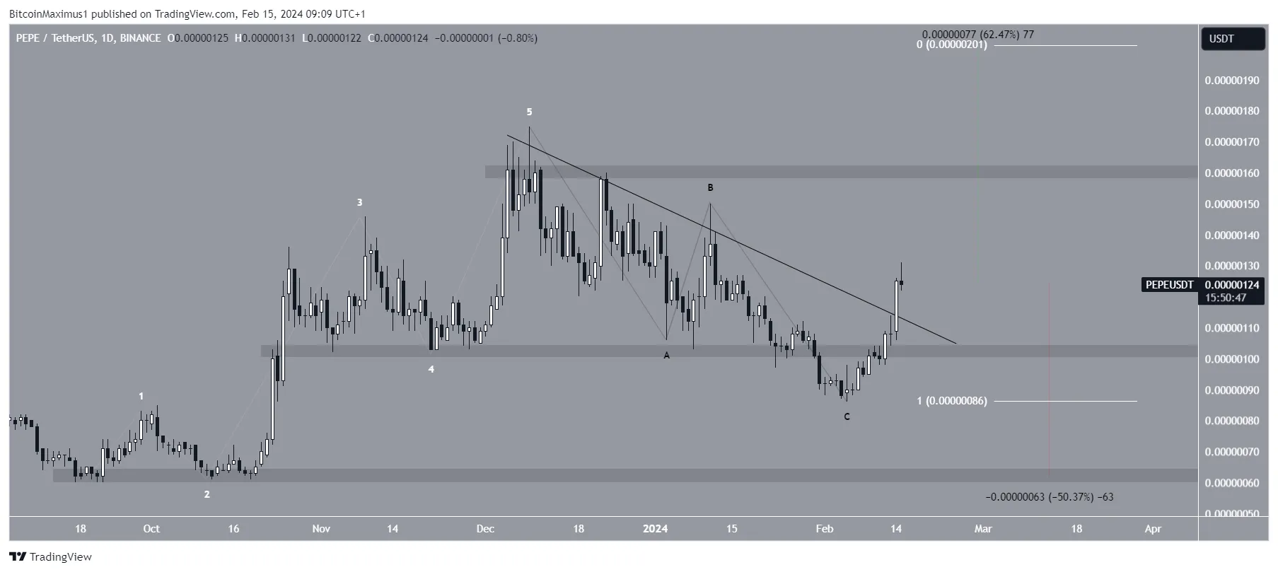 Технический анализ дневного таймфрейма показывает, что PEPE находился под диагональной линией сопротивления с декабря 2023 года. Нисходящее движение привело к минимуму в $0,00000086 5 февраля 2024 года.
