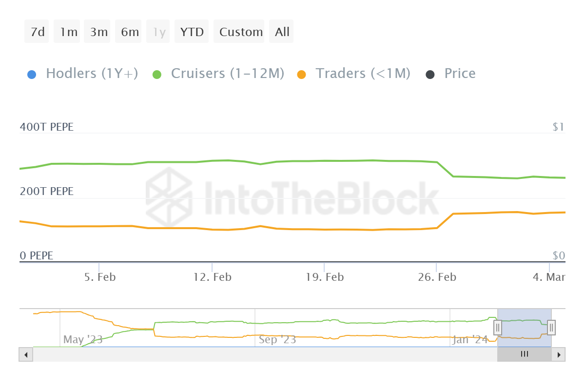 Эти трейдеры держат PEPE менее месяца и склонны к внезапным продажам. Если эти монеты не перейдут в руки среднесрочных держателей (адреса, которые держат актив от шести до 12-ти месяцев), то недавно приобретенные 48 трлн PEPE могут оказаться под повышенным давлением продаж, как только цена начнет пробуксовывать.