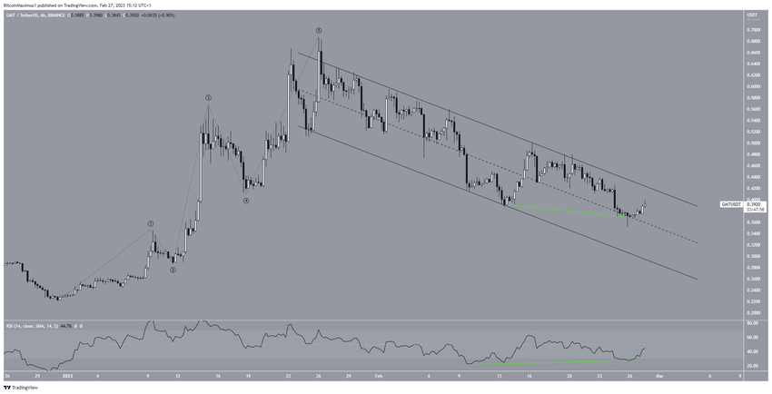 Во-первых, курс GMT торгуется внутри нисходящего параллельного канала. Такие каналы обычно ассоциируются с коррективными движениями. Сейчас цена находится в его верхней части, и это повышает шансы рынка на потенциальный бычий прорыв из этого паттерна.