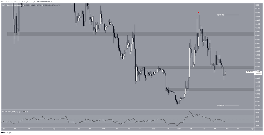 В процессе снижения, 25 февраля, GMT достиг минимума на $0,352, а также пробил область $0,415. Таким образом, сейчас токен торгуется сразу под двумя важными сопротивлениями. Ближайшая поддержка находится на $0,31.