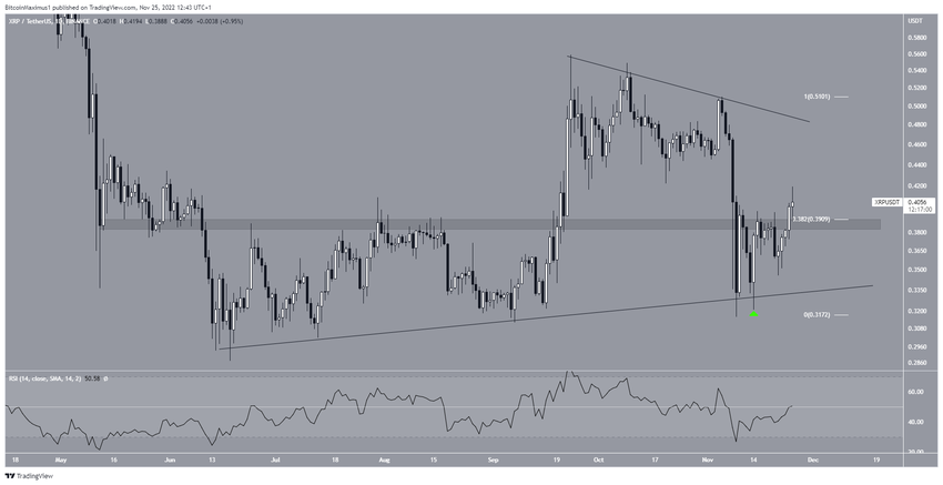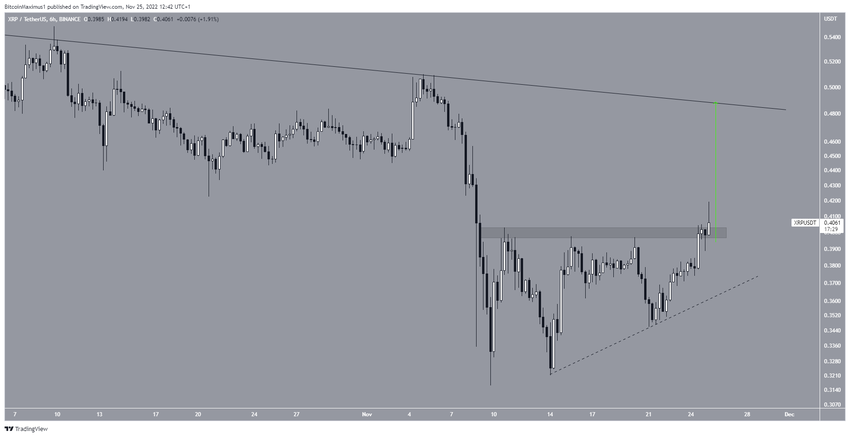 Курс XRP торгуется внутри восходящего треугольника, который считается бычьим паттерном. Бычий прорыв на всю длину треугольника (зеленый цвет) может подбросить цену до вышеупомянутой линии сопротивления на $0.47.