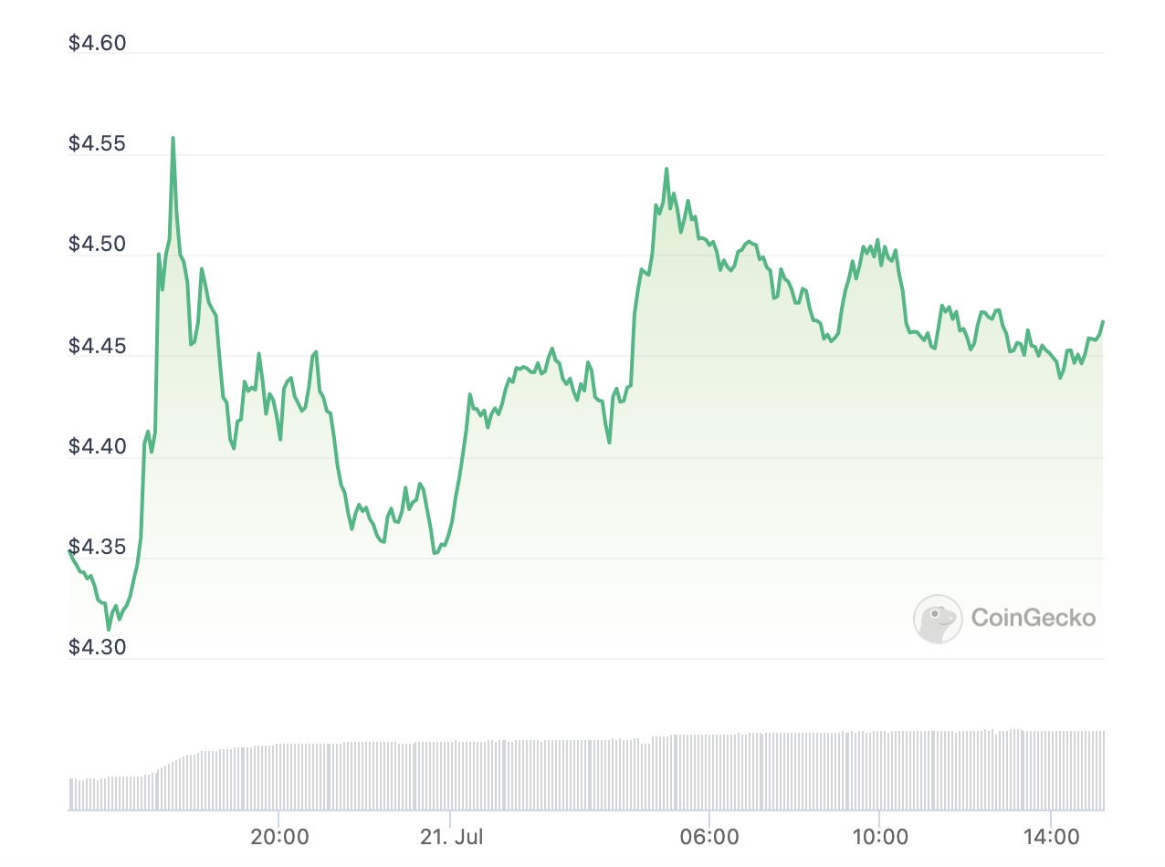 На фоне новостей о выпуске устройства для добычи FIL цена токена увеличилась на 2,6% за последние 24 часа, до $4,56. Токен сохраняет устойчивую цену даже не смотря на то, что в прошлом месяце Комиссия по ценным бумагам и биржам США (SEC) в иске к криптобиржам Binance и Coinbase назвала FIL ценной бумагой.