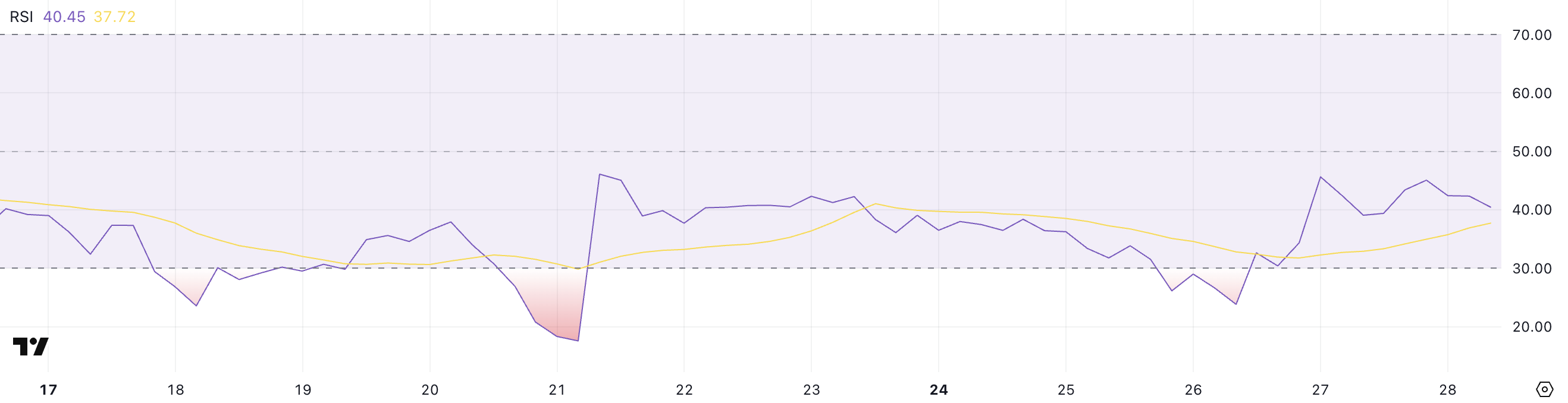 В динамике Pi Network появились первые признаки восстановления: индекс относительной силы (RSI) поднялся до 40,45 после падения до 23,8 два дня назад.