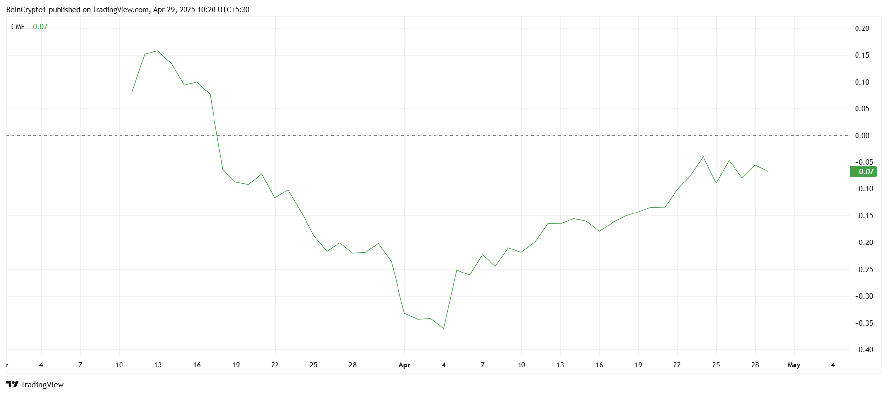 Индикатор Chaikin Money Flow (CMF) показывает, что Pi Network фиксирует некоторые притоки. Тем не менее показатель все еще находится ниже нулевой/нейтральной линии — это означает, что на рынке альткоина по-прежнему доминируют оттоки капитала.