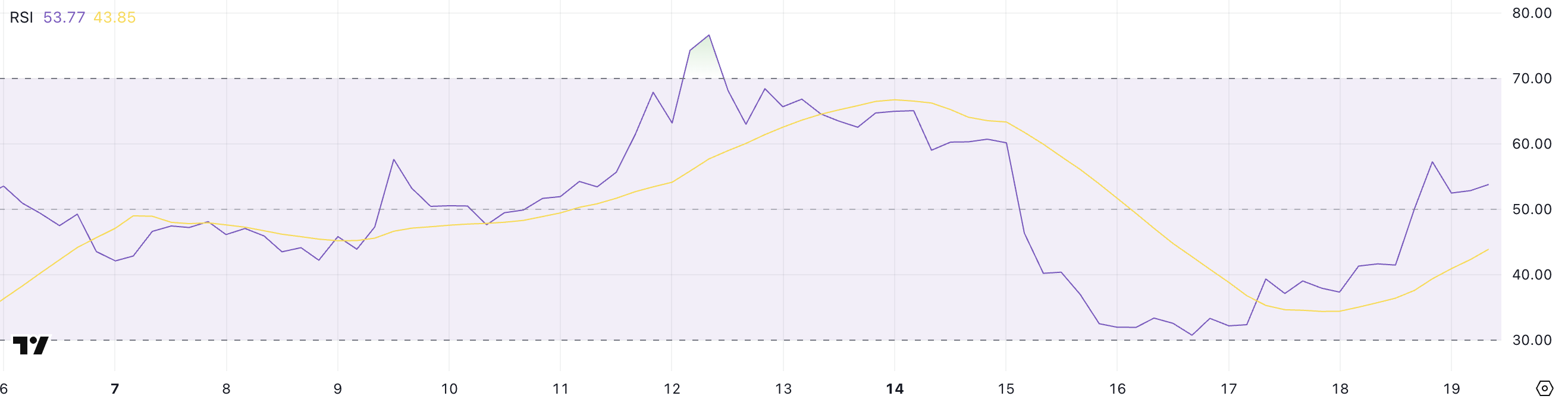 RSI на момент написания составляет 53,77, что отражает значительное восстановление от уровня 32,34, наблюдавшегося два дня назад.