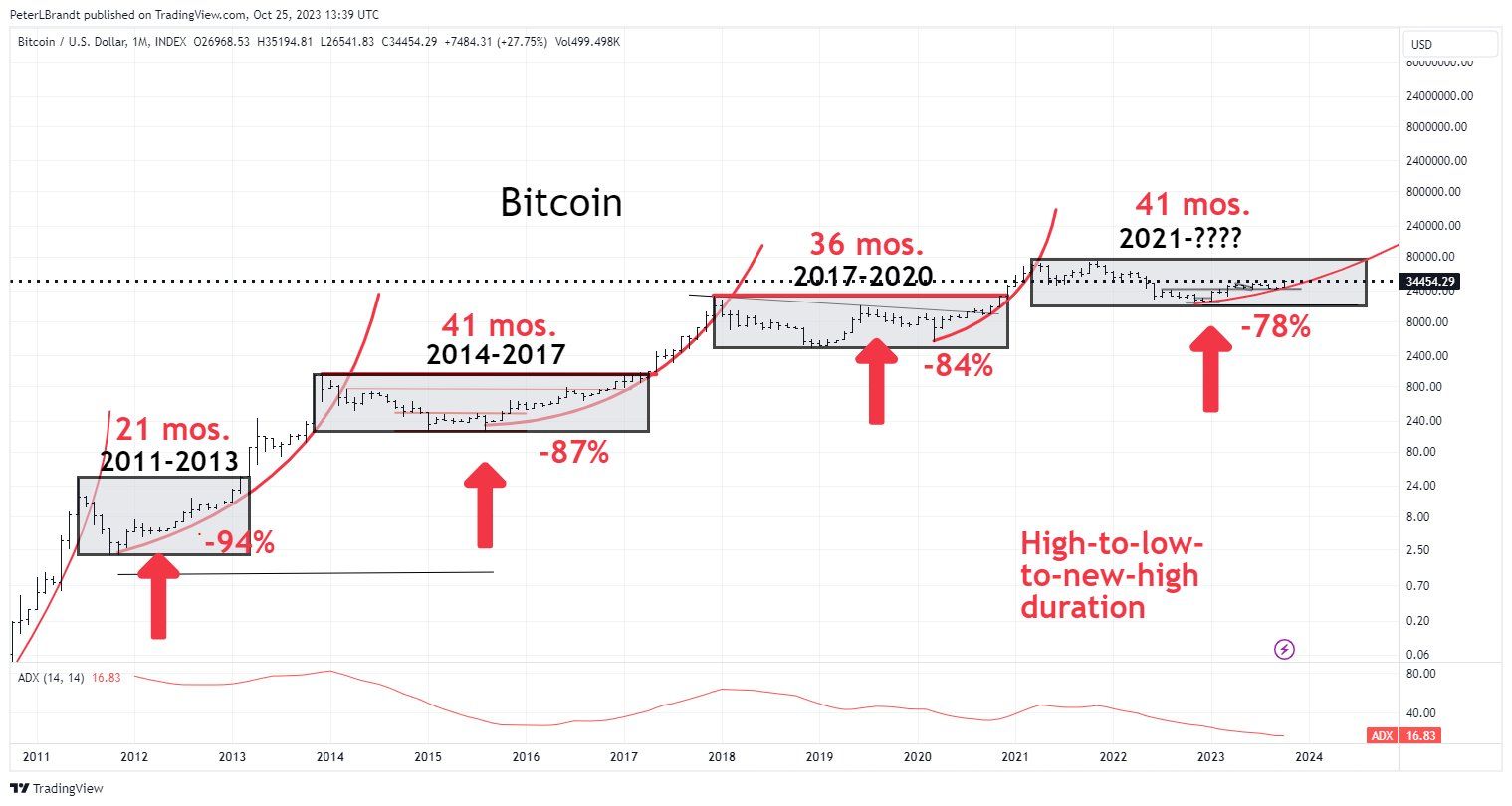 Питер Брандт считает, что крипторынок уже прошел циклические минимумы. Напомним, на фоне краха криптобиржи FTX в ноябре 2022 года биткоин опускался до $15 тыс. Судя по графику аналитика, он ждет продолжение роста BTC с обновлением абсолютного максимума на уровнях выше $100 000.
