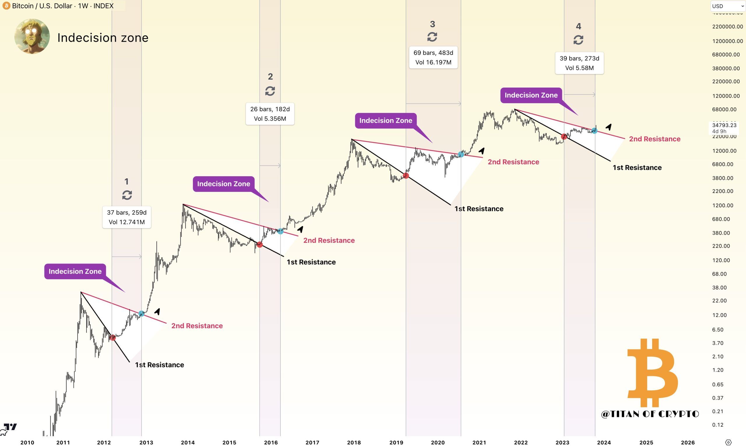 Также перспективы роста BTC видит аналитик и трейдер Titan of Crypto. По его наблюдениям, реализованный монетой рост позволил ее курсу прорвать важный уровень сопротивления. История наблюдений показывает, что такое поведение биткоина может говорить о перспективе его дальнейшего роста.