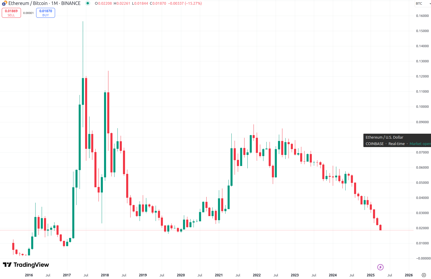 Еще один участник криптосообщества отметил, что покупка ETH была его самой огромной ошибкой. PlanB попытался его успокоить, подчеркнув, что курс ETH/BTC снова упал ниже 0,02 — до уровня марта 2016 года. Это означает, что почти все, кто покупал альткоин на протяжении последних девяти лет, могли бы получить лучшую доходность, вложившись в биткоин.