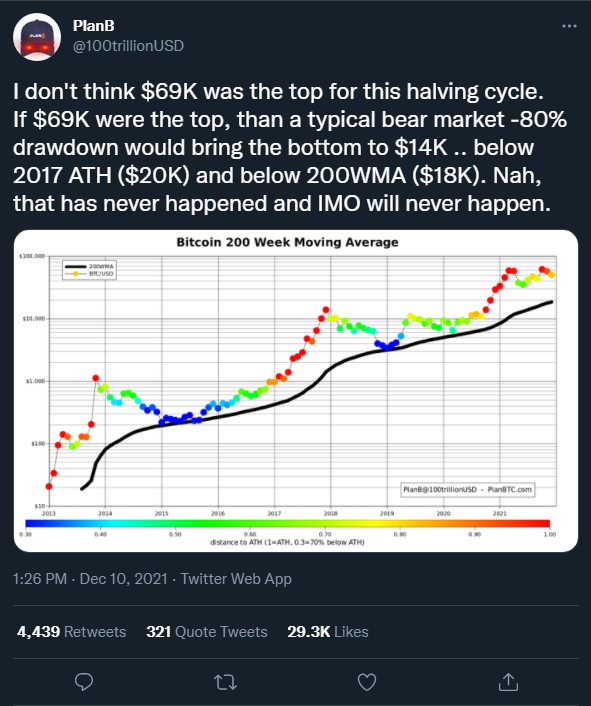 Нидерландский аналитик под псевдонимом PlanB спрогнозировал последствия медвежьего рынка. Об этом он написал у себя на странице в твиттере. По его словам, если рассматривать взятие биткоином отметки в $69 000 как максимум цикла, то среднестатистический медвежий обвал (-80%) обрушит цену криптовалюты ниже 200-недельной скользящей средней (200WMA). Это, в свою очередь, означает, что цена биткоина может упасть до $14 000.