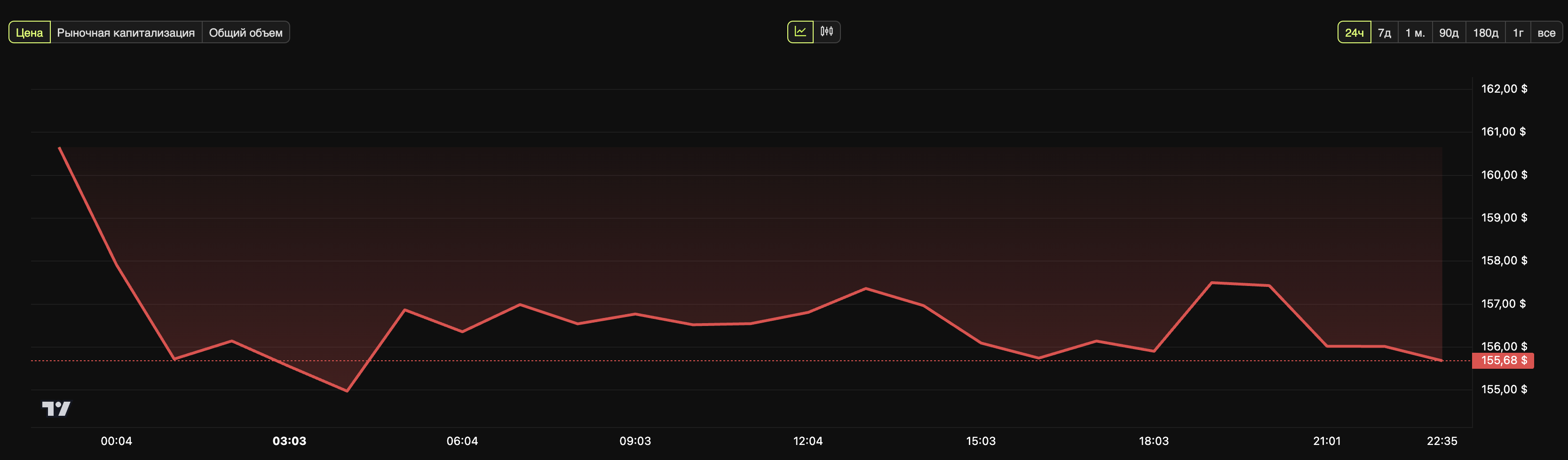 Pump.fun перевел более 798 000 токенов SOL (основная монета Solana) на биржи, спровоцировав ценовые колебания. За сутки криптовалюта подешевела на 3%, однако на недельном интервале падение достигло 8%. На момент публикации SOL торгуется на уровне $155.68, а ончейн-данные указывают на растущее давление продавцов.