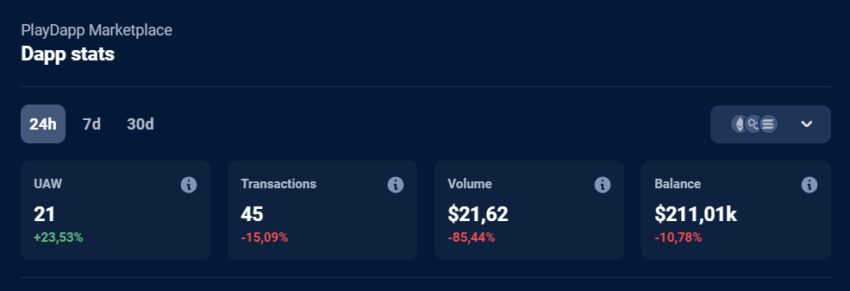 Согласно DappRadar, общая стоимость активов на PlayDapp тем временем просела на 10,7% до $211 млн. При этом количество уникальных активных адресов на платформе выросло на 23%.
