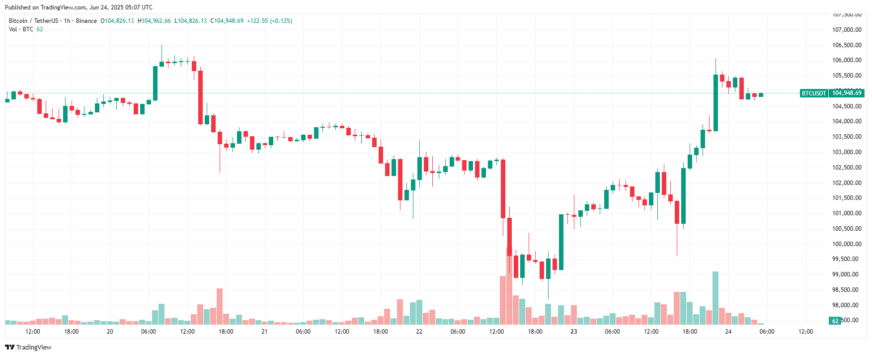 На фоне обострения конфликта на Ближнем Востоке курс биткоина превратился в настоящие американские горки. На новостях о том, что Иран запустил ракеты по военным базам США в Катаре BTC в моменте снижался до $98 000, но быстро отыграл потери на сообщениях о прекращении огня. На момент написания обзора, криптовалюта торгуется по $104 948.