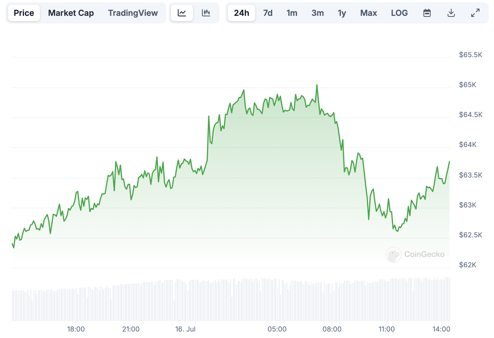 По данным CoinGecko, на момент написания материала первая по капитализации криптовалюта торгуется на отметке в $63 452. За последние сутки котировки актива выросли на 1,9%. Однако это все еще на 13,9% ниже абсолютного максимума, достигнутого биткоином в марте этого года.