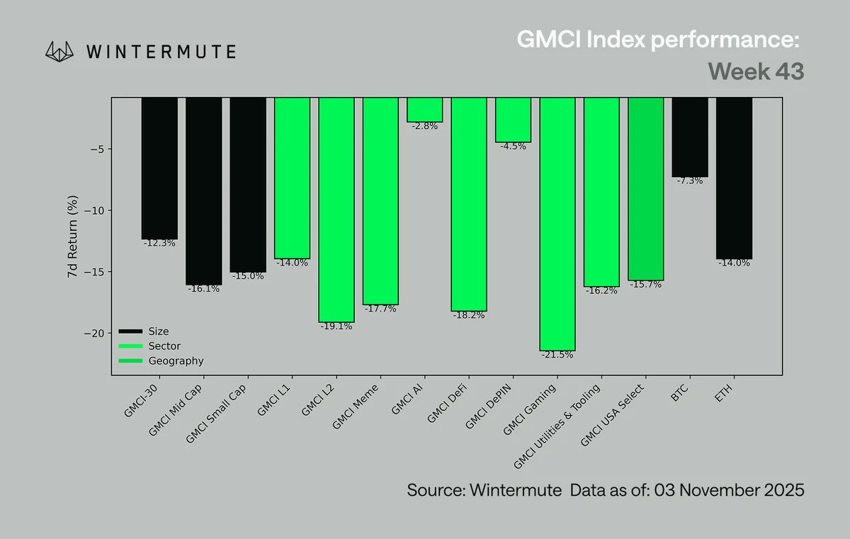 Относительную устойчивость показали только AI-проекты (токены, связанные с искусственным интеллектом, минус 3%) и DePIN (децентрализованные физические инфраструктуры, минус 4%), чему способствовал рост отдельных активов вроде TAO и agent.