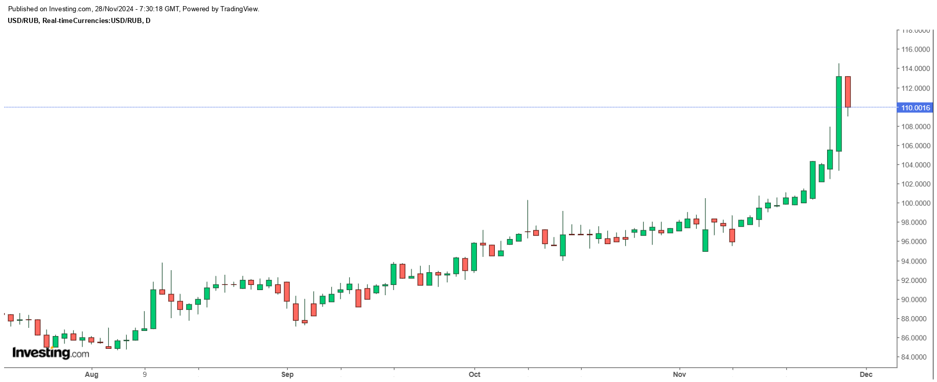 27 ноября 2024 года доллар в моменте подорожал до ₽114. Официальный курс доллара в ЦБ на день при этом был установлен на уровне ₽105.