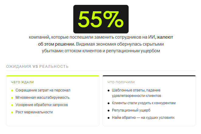 По данным исследований, 55% компаний, которые поспешили заменить сотрудников ИИ, теперь жалеют об этом решении — экономия обернулась оттоком клиентов и репутационным ущербом. Такие исследования стоит почаще считать владельцам бизнеса, которые искренне считают, что «Claude и ко» заменит им всех сотрудников.