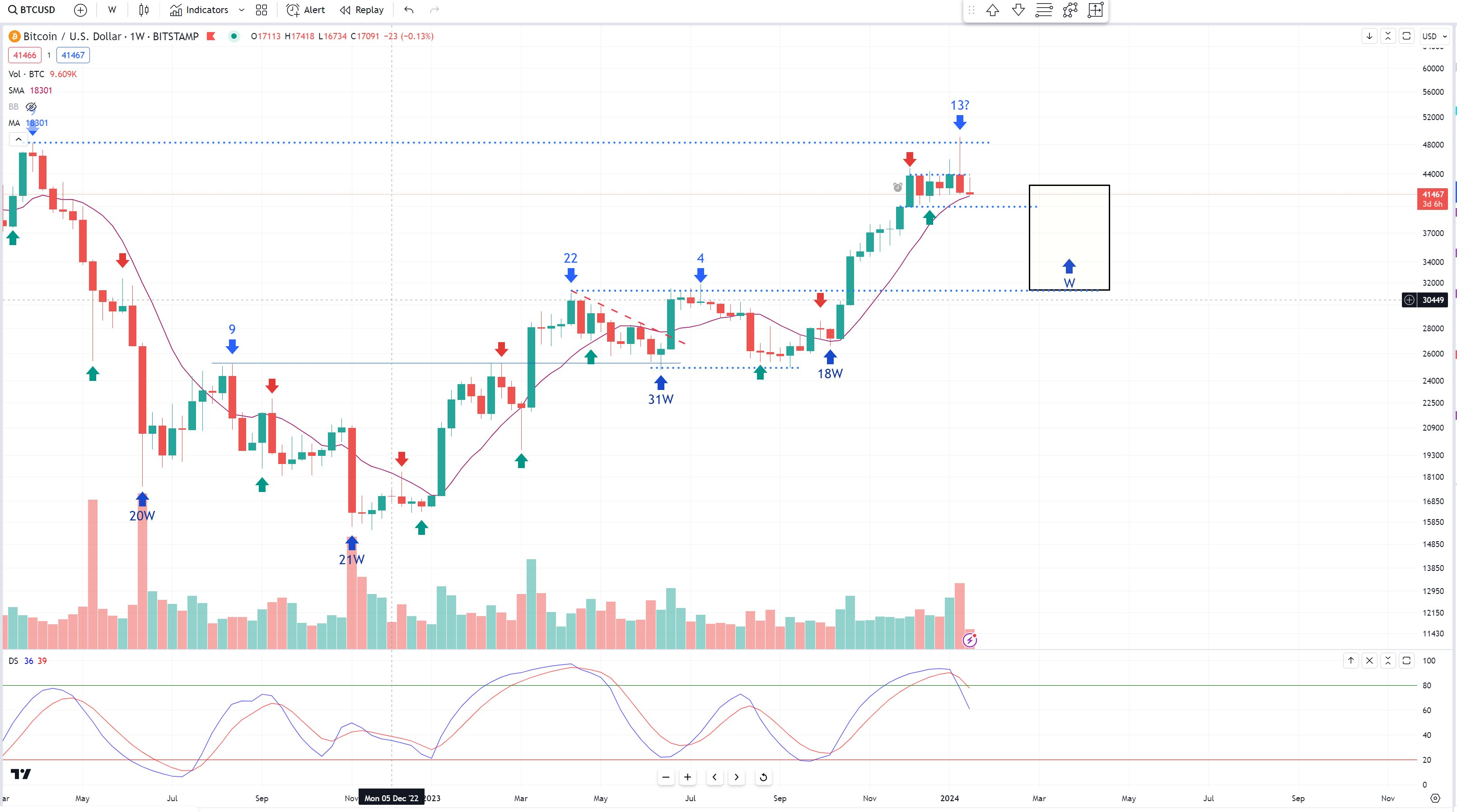 Многие участники криптосообщества поддержали прогноз биткоина, который не исключает падения криптовалюты в район $30 тыс. весной 2024 года. Аналитики считают, что коррекция BTC перед халвингом, который может состояться в апреле 2024, станет последним шансом закупиться монетой по привлекательному курсу.