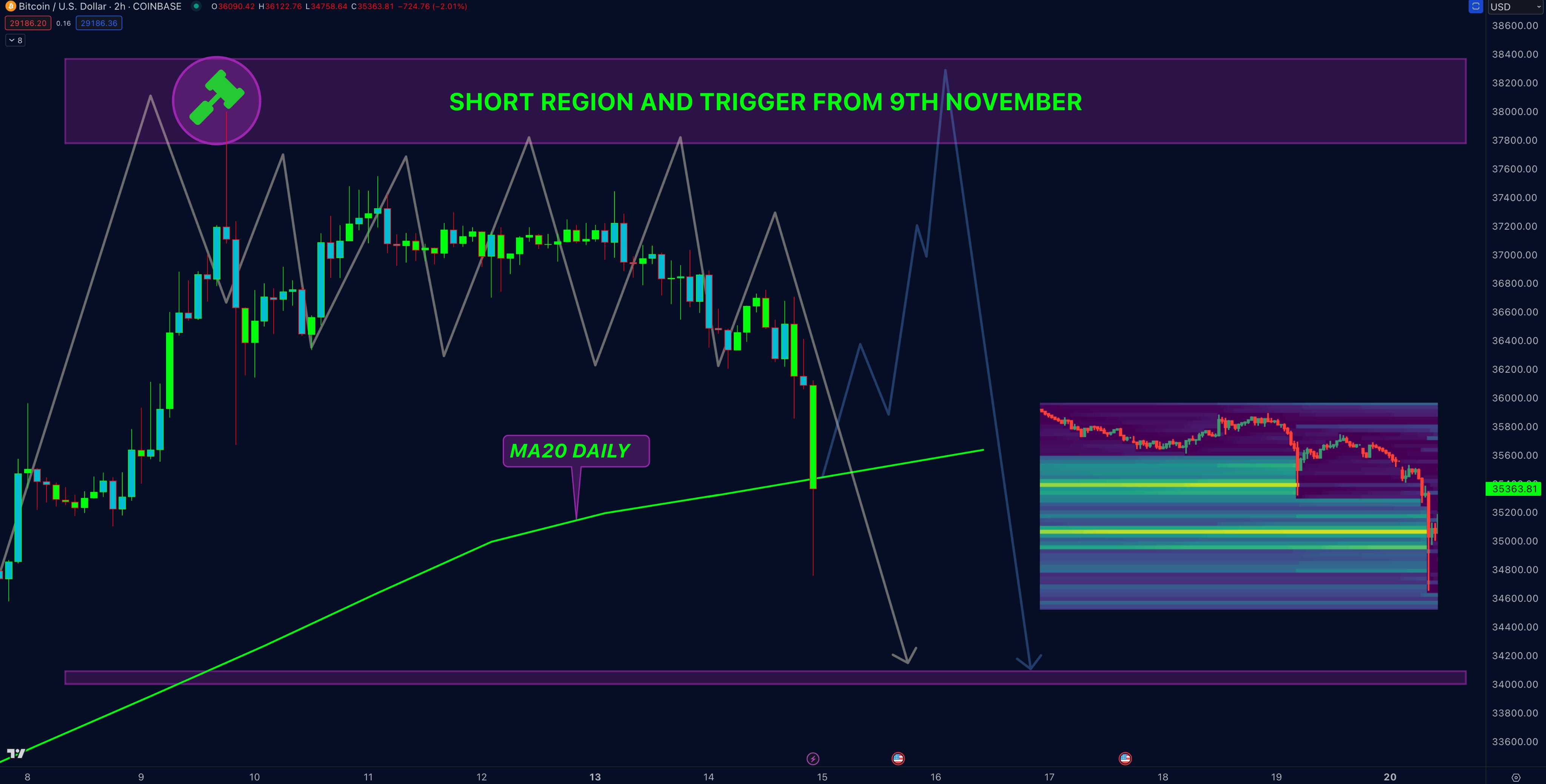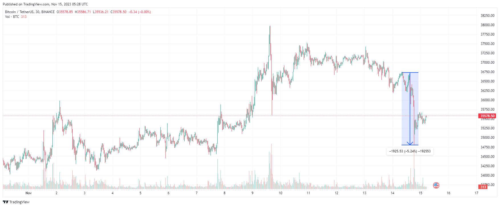 14 ноября 2023 года биткоин начал падать. К вечеру криптовалюта снизилась более чем на 5%. Минимум BTC за 24 часа, по данным CoinMarketCap — $34 948, максимум — $36 753. По состоянию на момент написания обзора, монета торгуется по $35 578.