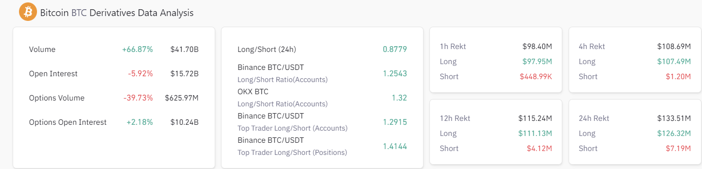 Несмотря на позитивные новости, биткоин вышел в падение. У отрицательной динамики BTC может быть несколько причин. Она из них — резкие движения на рынке фьючерсов. На фоне выхода статистики CPI объемы ликвидаций по длинным позициям BTC выросли до $97.9 млн. Им предшествовали ликвидации на $126.3 млн за сутки. Такие объемы ликвидаций могли оказать давление на курс криптовалюты.