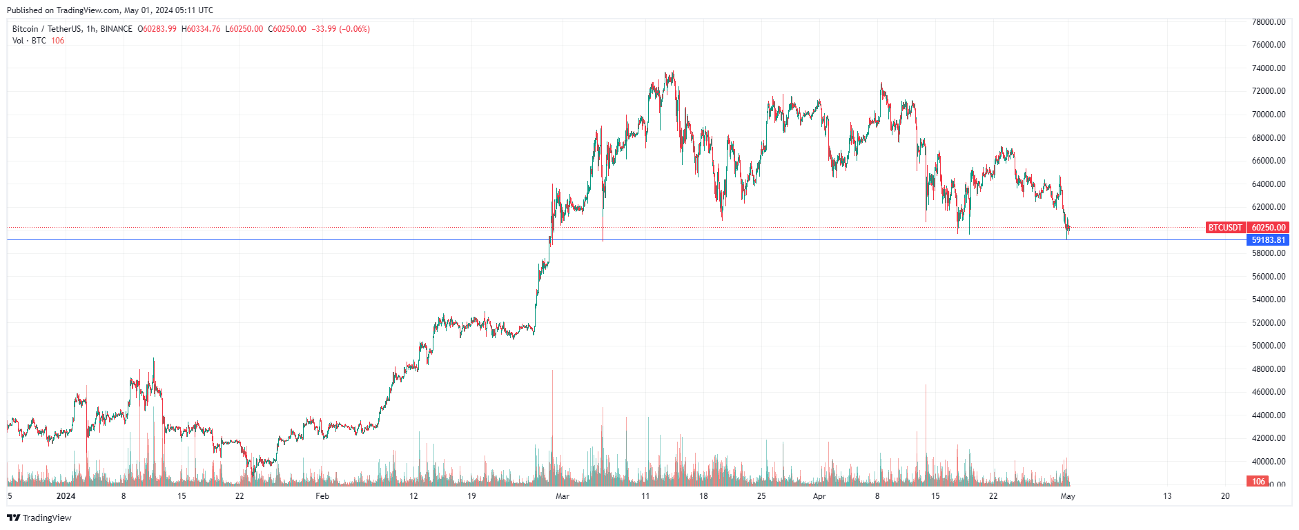 Во вторник 30 апреля биткоин в моменте снизился до $59 тыс. — уровня, которого монета в последний раз касалась 5 марта 2024 года. После криптовалюта скорректировалась к $60 тыс. По состоянию на момент написания обзора, биткоин торгуется по $60 250.