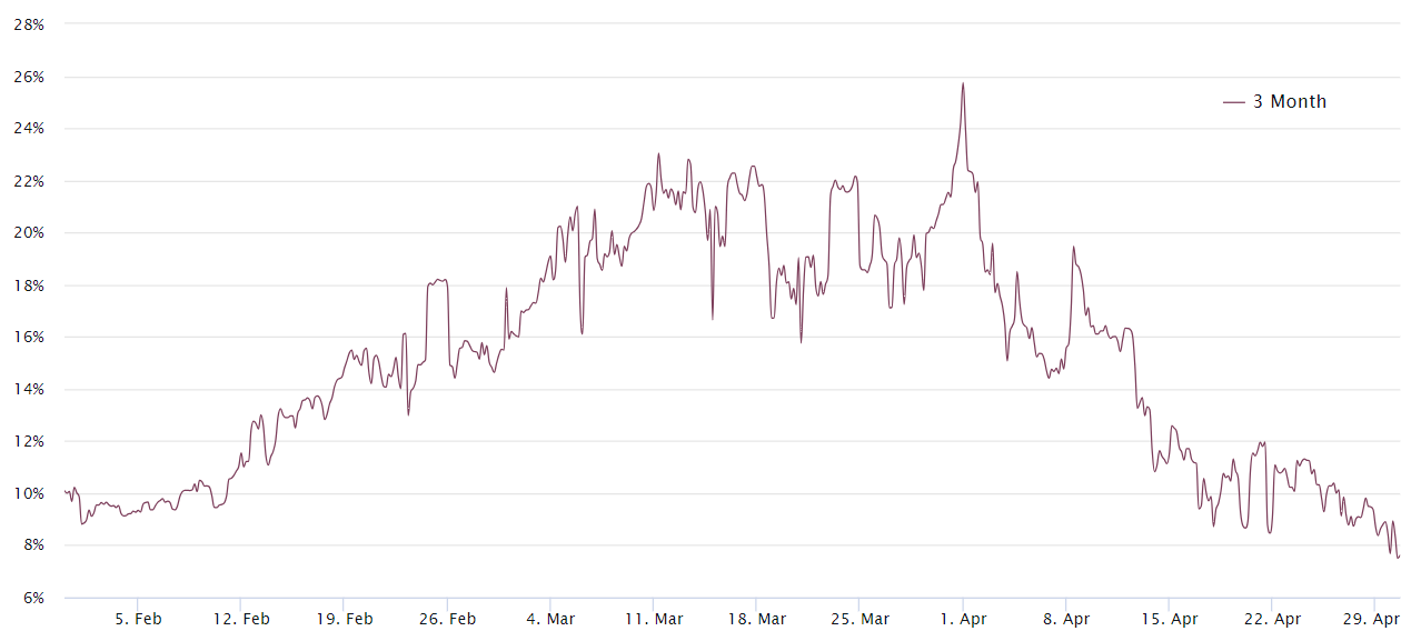 Есть несколько причин, которые могли способствовать падению биткоина. Одной из них может быть снижение премии на BTC-фьючерсы. Метрика достигла пятимесячного минимума, что указывает на ослабление интереса к монете со стороны инвесторов и уменьшение спекулятивного спроса.