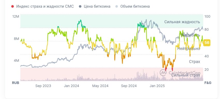 Индекс страха и жадности биткоина в моменте опустился до нейтрального уровня 56 пунктов. Изменения говорят об охлаждении интереса инвесторов к риску ради инвестиций в криптовалюту.