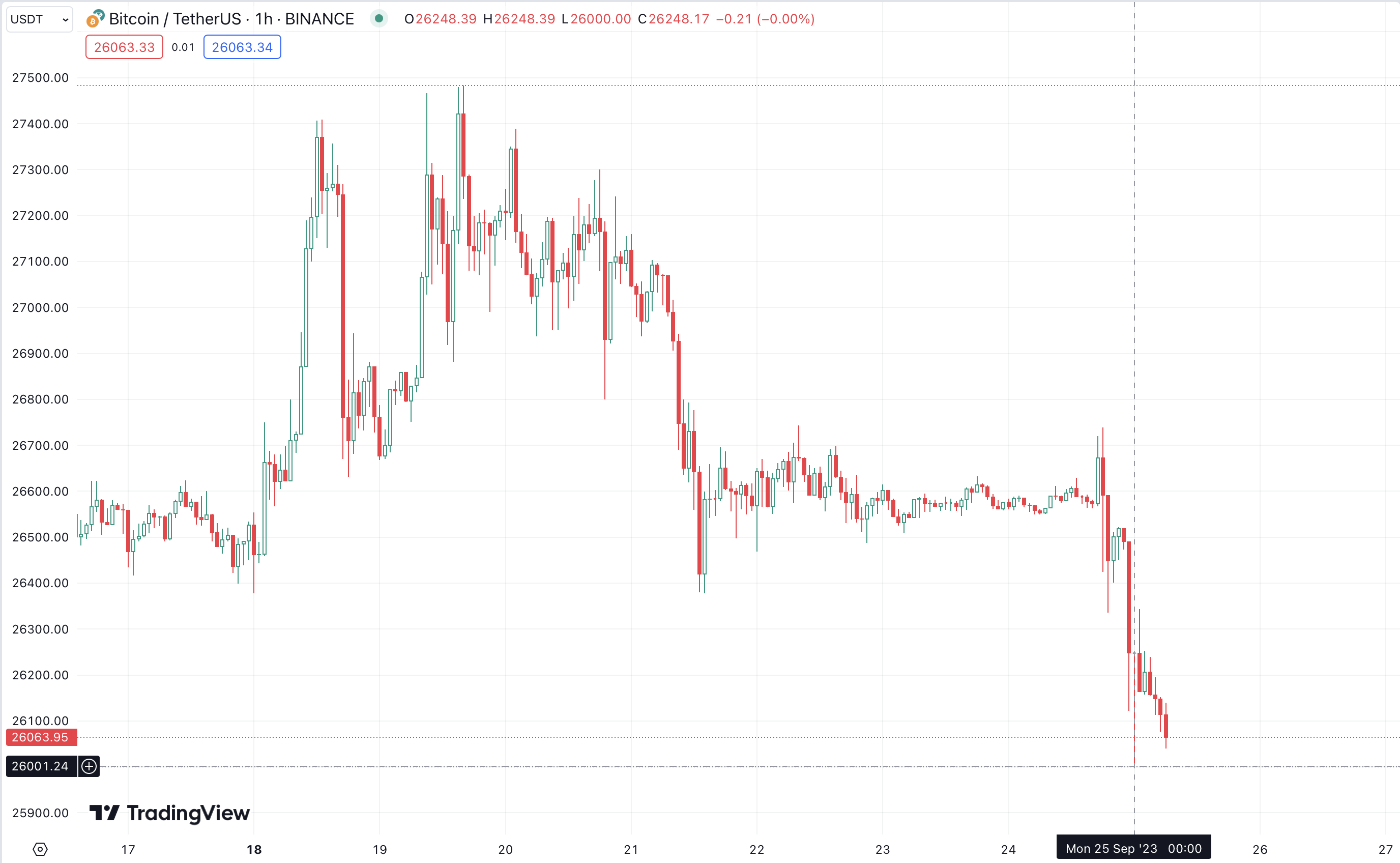 После нескольких попыток биткоин так и не смог преодолеть уровень сопротивления $27 500 и начал новое снижение. Пробив два уровня поддержки на отметках $27 000 и $26 500, цена главной криптовалюты вошла в «медвежью» зону.