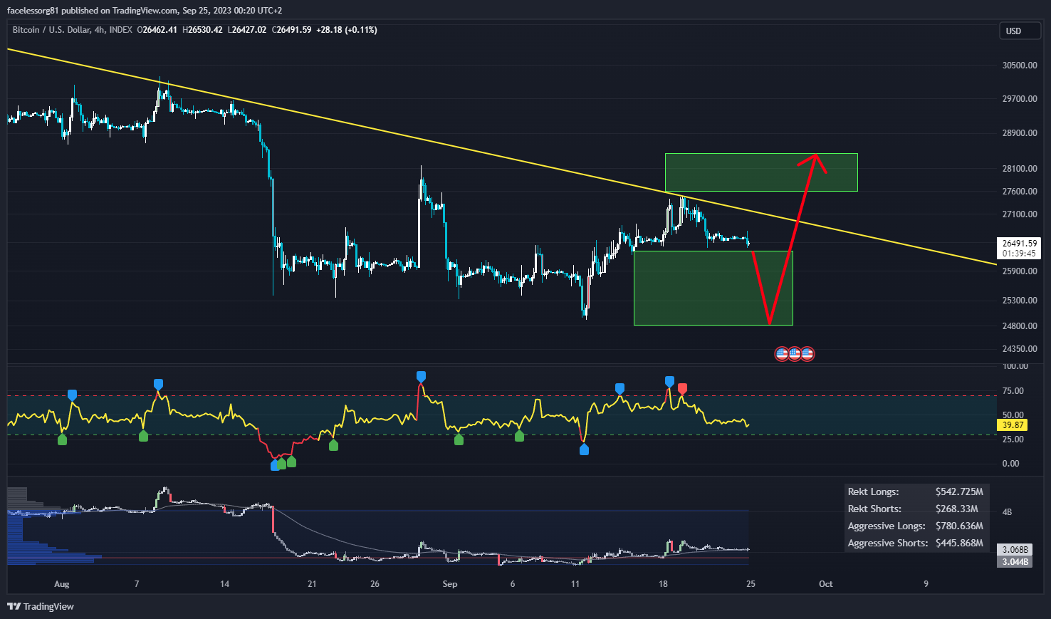Следующее ключевое сопротивление может находиться вблизи уровня $26 700. В случае прорыва и закрепления выше него биткоин получит бычий импульс и начнет восходящее движение к $27 000, а затем и $27 500.