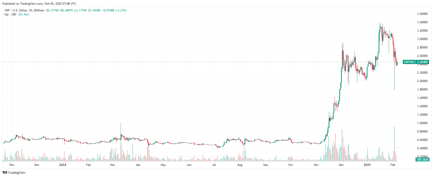 Позитивные новости помогли XRP подорожать на 555% в период с 6 ноября 2024 по 17 января 2025. Затем под гнетом общего падения рынка токен скорректировался. На момент написания обзора, криптовалюта Ripple торгуется по $2,4.