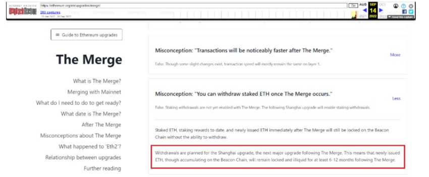 Функционал снятия средств должен быть реализован в обновлении «Шанхай». Однако сроки его реализации постоянно отодвигаются. Официальный сайт даже убрал установленные сроки и незаметно изменил свою позицию в отношении вывода размещенных на стейкинге ETH: