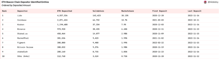 30,10% ETH в настоящее время контролирует протокол Lido Finance, 13,70% — Coinbase, 7,90% — Kraken и еще 6,40% — Binance. По данным Dune Analytics, в общей сложности, более 60% ETH на стейкинге контролируют четыре организации.