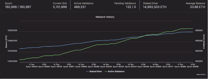 С тех пор как в сети Ethereum появилась возможность стейкинга, пользователи внесли туда почти 15 млн ETH. По курсу на момент публикации это более $18 млрд. Сейчас в сети всего 467 399 уникальных валидаторов:
