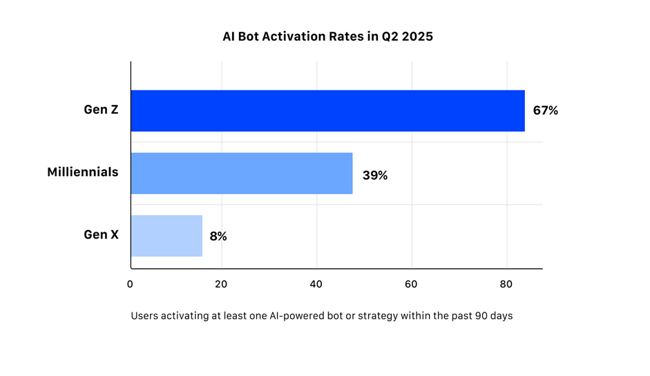 Анализ платформы выявил, что из более чем 780 000 пользователей 67% трейдеров поколения Z (18–27 лет) уже используют или активно изучают инструменты на базе ИИ. Эти молодые трейдеры применяют автоматизацию не только для удобства, но и для управления рисками, снижения эмоционального влияния и делегирования стратегических решений в условиях волатильного рынка.