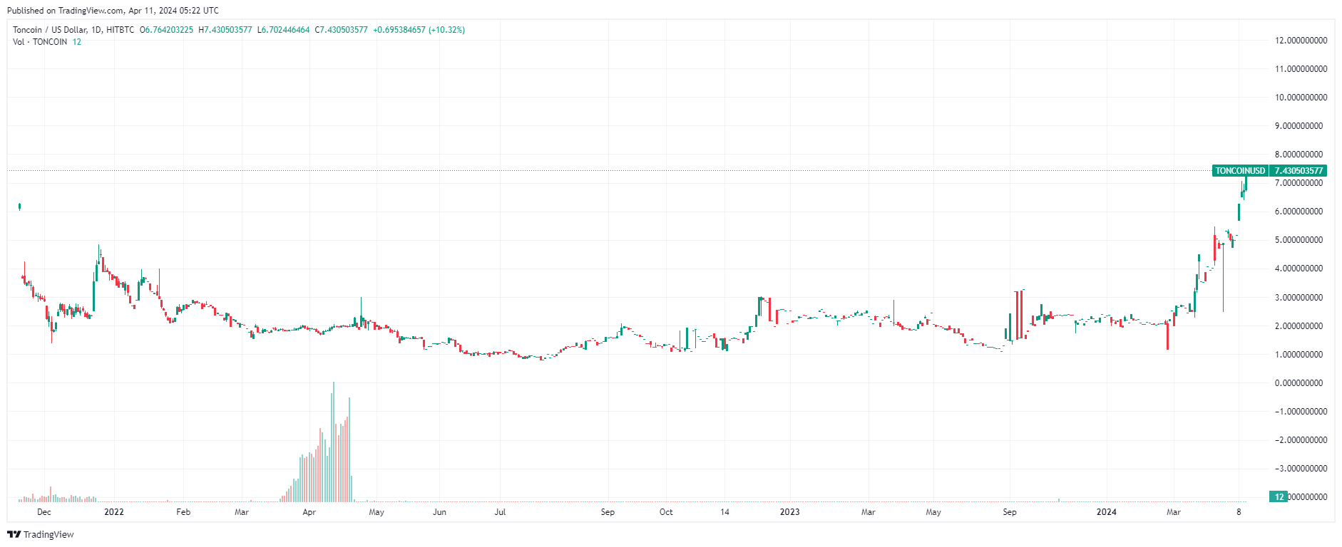 Sponsored SponsoredПоддержка Toncoin командой Телеграм позволила криптовалюте 11 апреля 2024 года обновить абсолютный максимум стоимости на уровне $7,45 и закрепить за собой место в топ-10 самых капитализированных монет.