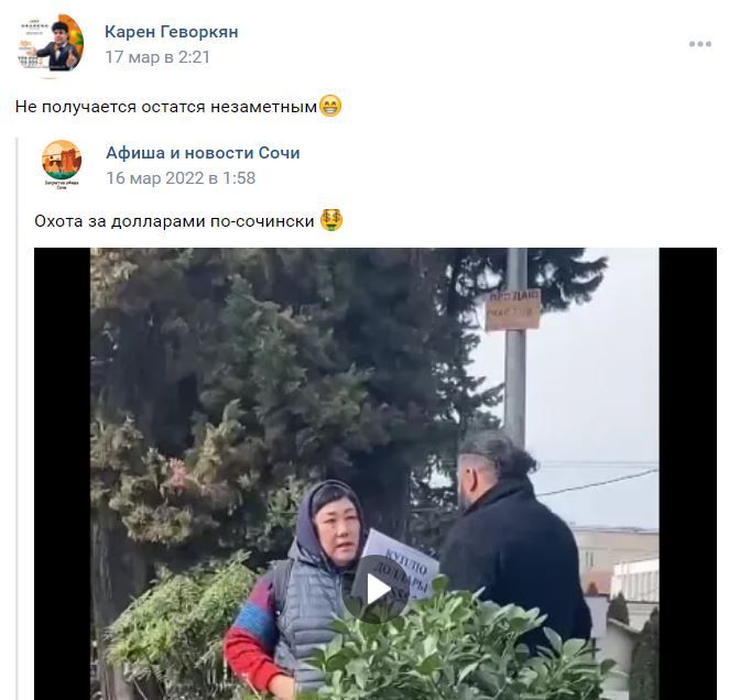 В сюжет СМИ об уличных менялах Сочи попал Карен Геворкян. Мужчина называет себя президентом Республики Хоста Рика (речь идет о базе отдыха в Хостинском районе Сочи). В своих социальных сетях Карен Геворкян открыто говорит о бизнесе по обмену валют. Вот одно из видео бизнесмена: