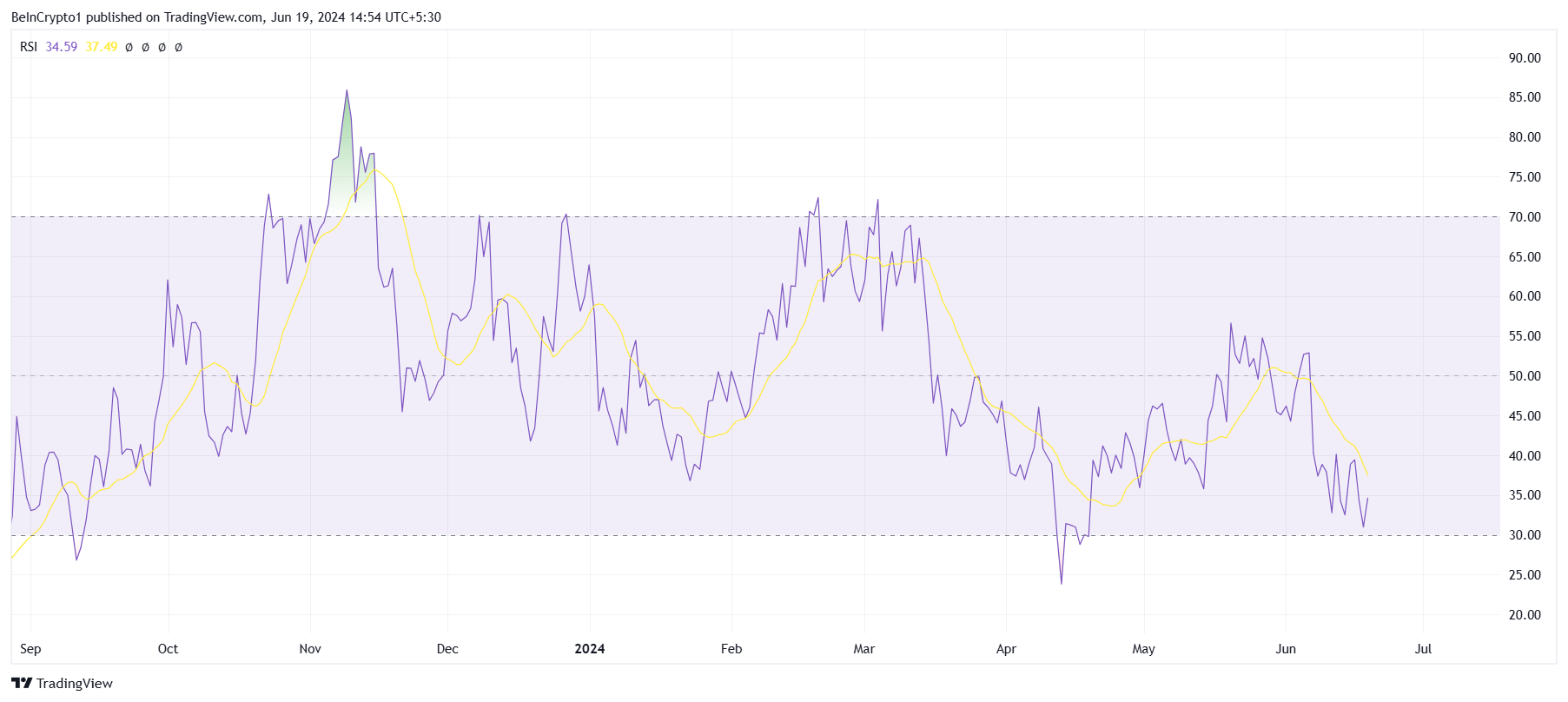 Это видно по индексу относительной силы (RSI), который измеряет скорость и изменения ценовых движений. Обычно его используют для определения перекупленности или перепроданности на рынке. Он варьируется в диапазоне от 0 до 100, где значения выше 70 указывают на перекупленность, а ниже 30 — на перепроданность.