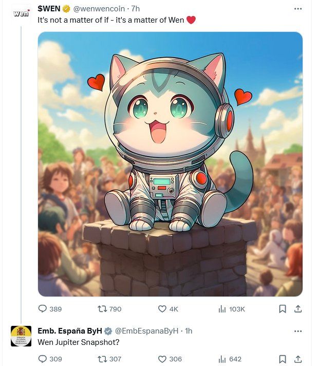 Начиная с 30 января в профиле испанского посольства появилось сразу несколько твитов, которые были ответами на посты о предстоящих раздачах токенов. Больше всего политиков заинтересовали аирдропы WEN, Jupiter и Dymension.