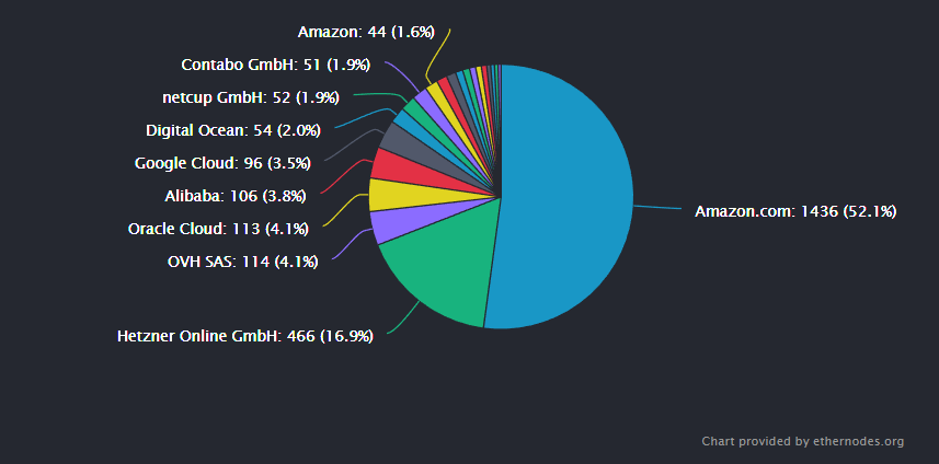 Зависимость многих нод в сети Ethereum от Amazon подтверждается и другими аналитическими площадками. По данным Ethernodes, на AWS развернуто 1436 нод, на Hetzner — 416, а на OVH — 114 нод. Примечательно, что на Alibaba развернуто 106 нод, однако в процентном выражении китайский хостинг контролирует лишь 3,8% нод.
