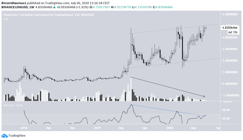 Здесь цена с июня 2019 года торгуется внутри параллельного восходящего канала. Как и в случае с LINK/BTC, по недельному RSI наблюдаются многочисленные сигналы медвежьей дивергенции, а торговые объемы постепенно сокращаются на протяжении всего бычьего хода.